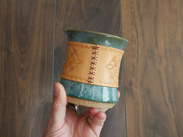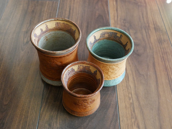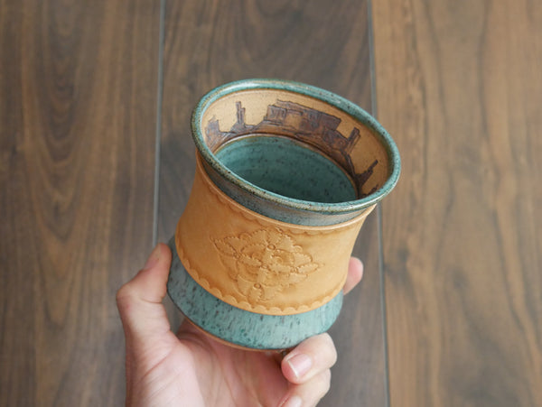 Wheel-thrown and hand carved inside of the tumbler this desert landscape will greet you as your take sips of your favorite beverage, day dreaming about red sandstone adventures.