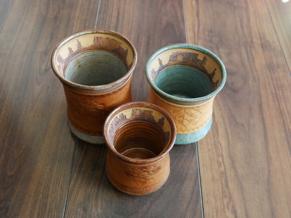 Wheel-thrown and hand carved inside of the tumbler this desert landscape will greet you as your take sips of your favorite beverage, day dreaming about red sandstone adventures.