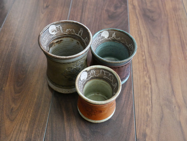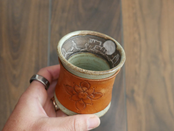 Wheel-thrown and hand carved inside of the tumbler this desert landscape will greet you as your take sips of your favorite beverage, day dreaming about red sandstone adventures.