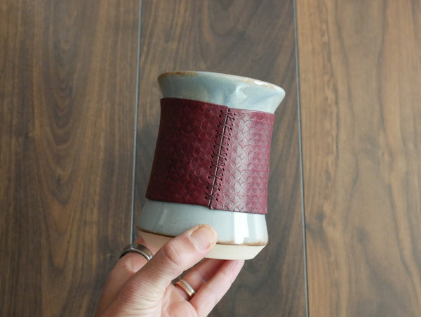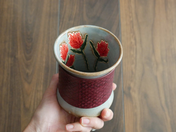 Wheel-thrown and hand carved inside of the tumbler you will be greeted with a bright wildflower to bring joy to your daily routines. A little pop of color inside your tumbler to harness the joys of summertime at any time of the year.